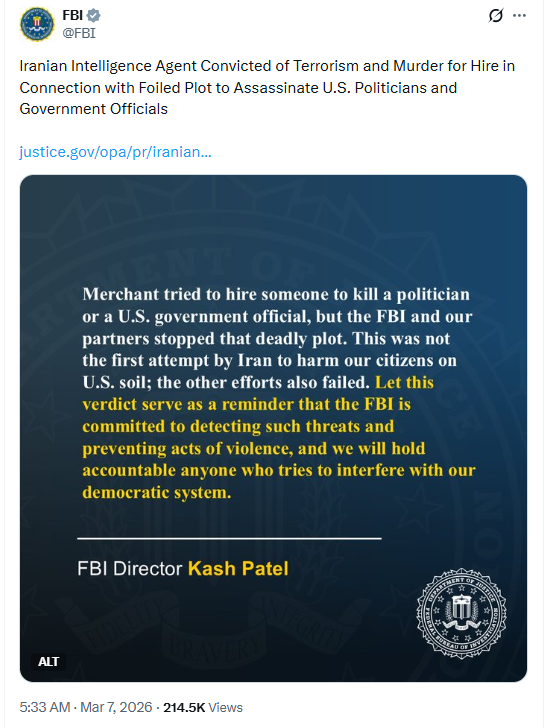 امریکہ میں وفاقی عدالت نے ایک پاکستانی شخص (جس کے مبینہ طور پر ایران سے روابط ہیں) کو صدر ڈونلڈ ٹرمپ یا دیگر امریکی حکام کو قتل کرنے کی سازش کا مجرم قرار دے دیا گیا۔