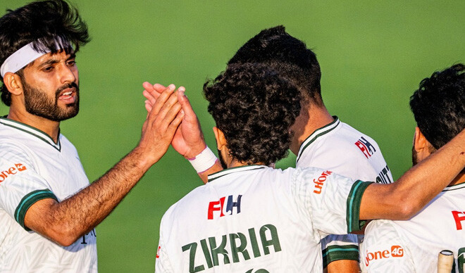 پاکستان نے پہلے کوارٹر میں ایک اور چوتھے کوارٹر میں تین گول کیے۔ (فوٹو: ایف آئی ایچ فیس بک)