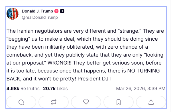 برطانوی خبر رساں ادارے روئٹرز کے مطابق جمعرات کو ٹروتھ سوشل پر ایک بیان میں صدر ٹرمپ نے کہا کہ ایرانی مذاکرات کار معاہدے کے لیے ’منتیں کر رہے ہیں‘ اور یہ دعویٰ کہ وہ شرائط کا جائزہ لے رہے ہیں، ’غلط‘ ہے۔