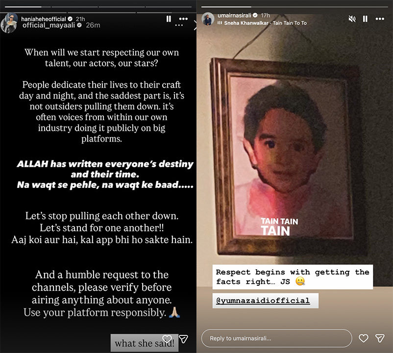 مایا علی نے سوال اٹھایا کہ آخر ہم اپنے ہی فنکاروں کی عزت کیوں نہیں کرتے۔ ہانیہ عامر نے ان کی بات کی تائید کرتے ہوئے اسے آگے شیئر بھی کیا۔ نامیر خان نے بھی اس رویے کو غیر ہمدردانہ قرار دیا۔