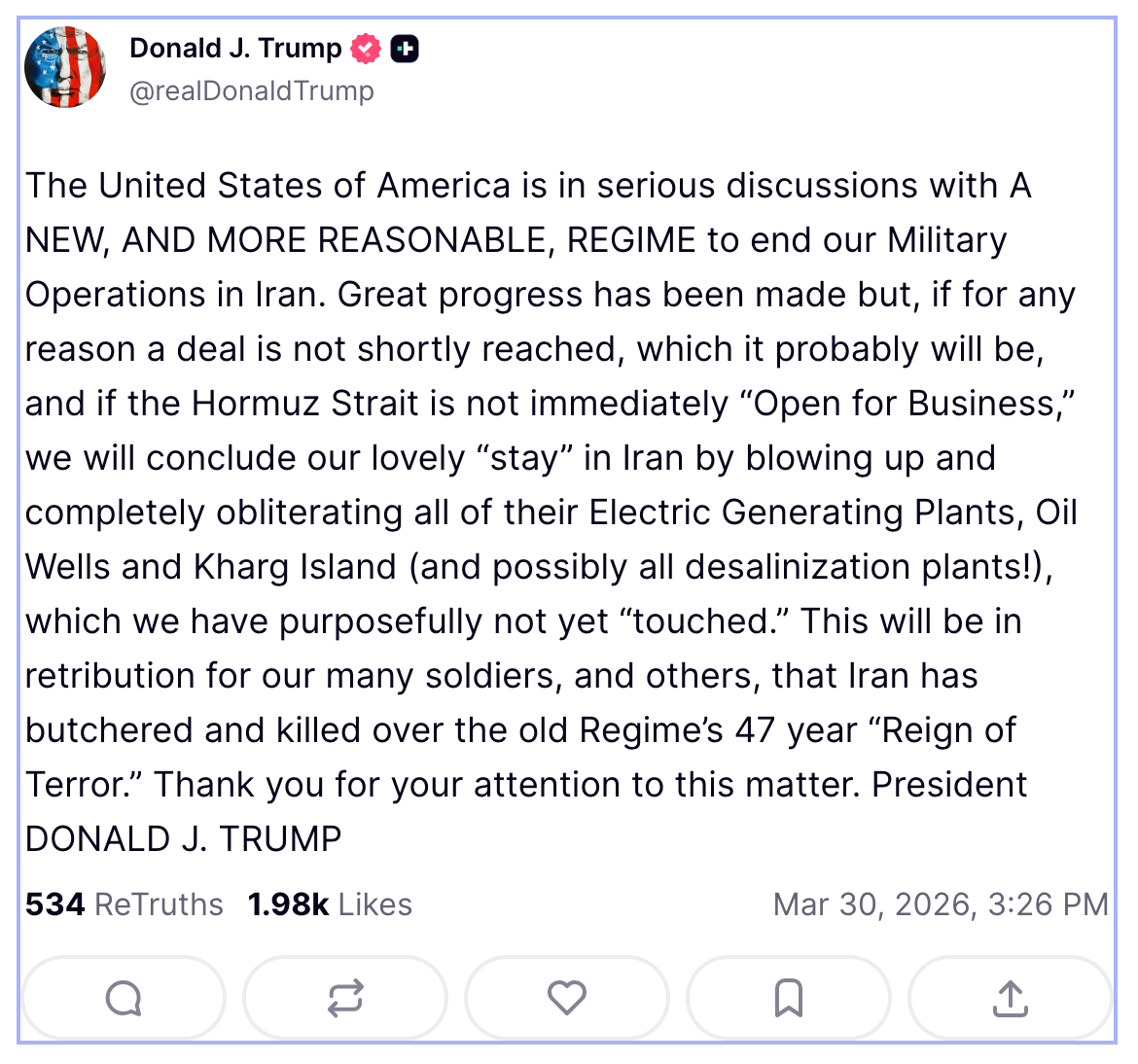 عرب نیوز کے مطابق صدر ٹرمپ نے پیر کو ایک سوشل میڈیا پوسٹ میں لکھا کہ ’نمایاں پیش رفت ہو چکی ہے، لیکن اگر کسی بھی وجہ سے جلد کوئی معاہدہ طے نہیں پاتا جو غالباً طے پا جائے گا اور آبنائے ہرمز کو اگر فوراً ’کاروبار کے لیے کھولا‘ نہ گیا، تو ہم ایران میں اپنے اس خوبصورت ‘قیام’ کا اختتام ان کے تمام بجلی پیدا کرنے والے پلانٹس، تیل کے کنوؤں اور خارگ جزیرے کو تباہ کر کے کریں گے۔‘