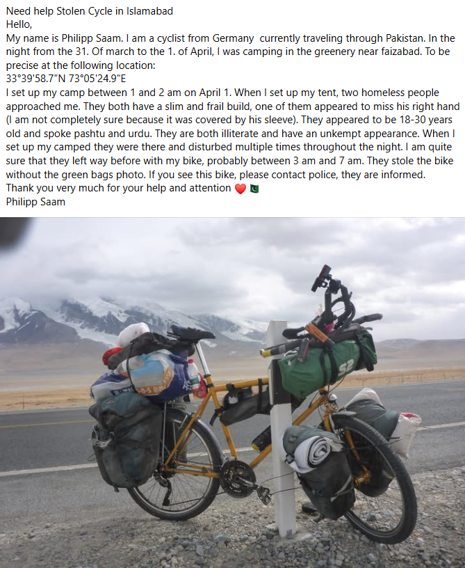یوں جرمن سیاح فلپ سام کی سائیکل اسلام آباد کے تھانہ کھنہ کی حدود سے چوری ہو گئی جس کی تلاش میں اب پولیس میں مصروف ہے۔