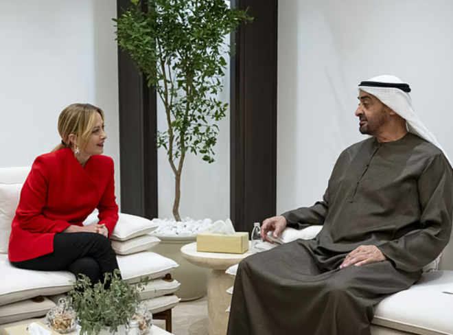 متحدہ عرب امارات کے صدر شیخ محمد بن زاید آل نہیان اور اٹلی کی وزیراعظم جارجیا میلونی نے حالیہ علاقائی صورتحال، اس کے سلامتی و استحکام پر سنگین اثرات، میری ٹائم سکیورٹی، توانائی کی فراہمی اور عالمی معیشت پر پڑنے والے اثرات پر تبادلہ خیال کیا گیا۔