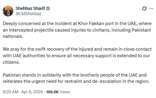 وزیراعظم شہباز شریف نے متحدہ عرب امارات کی خورفکان بندرگاہ میں پیش آنے والے واقعے پر تشویش کا اظہار کیا ہے جس میں ایک روکے گئے حملے کے نتیجے میں دیگر شہریوں سمیت پاکستانی بھی شامل ہیں۔