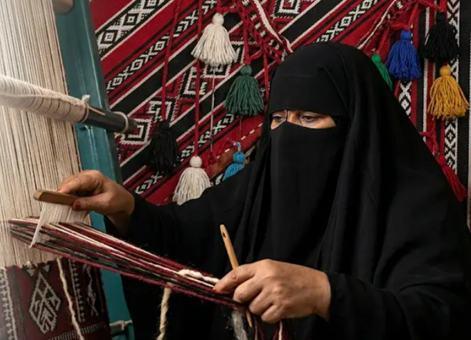 سعودی عرب کی قدیم اور روایتی دستکاری ’سدو‘ کی ماہر کاریگر ’ام فہد‘ نامی خاتون ہینڈ بیگ، بیلٹ اور دیوار پر نصب کرنے والی مختلف اشیا تیار کرتی ہیں۔