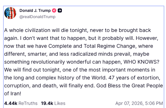 عرب نیوز کے مطابق صدر ٹرمپ نے منگل کو ٹروتھ سوشل پر ایک بیان میں کہا کہ ’ایک پوری تہذیب آج رات ختم ہو جائے گی اور پھر کبھی اُبھر نہیں ہو سکے گی۔ میں ایسا نہیں چاہتا، لیکن غالب امکان یہی ہے کہ ایسا ہو گا۔‘