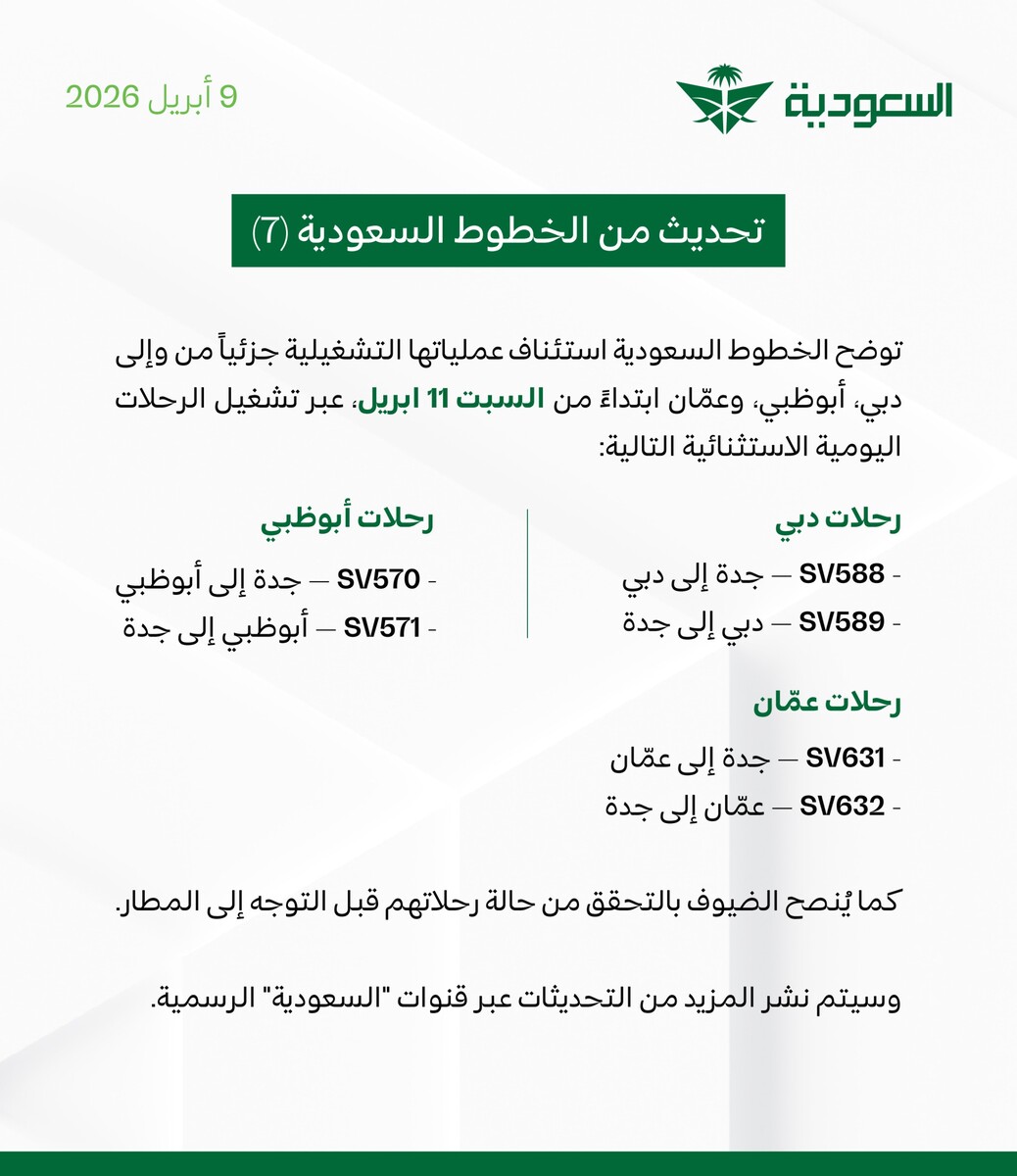 سعودی عرب کی قومی فضائی کمپنی السعودیہ نے سنیچر 11 اپریل سے دبئی، ابو ظبی اور عمان کے لیے جزوی طور پر پروازیں دوبارہ شروع کرنے کا اعلان کیا ہے۔