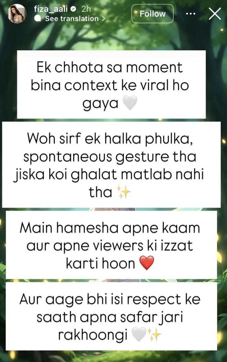 دوسری جانب تنقید کے بعد اب فضا علی نے سوشل میڈیا پلیٹ فارم انسٹاگرام پر اپنی سٹوری میں کہا کہ یہ ایک چھوٹا سا لمحہ تھا جسے سیاق و سباق کے بغیر وائرل کر دیا گیا۔