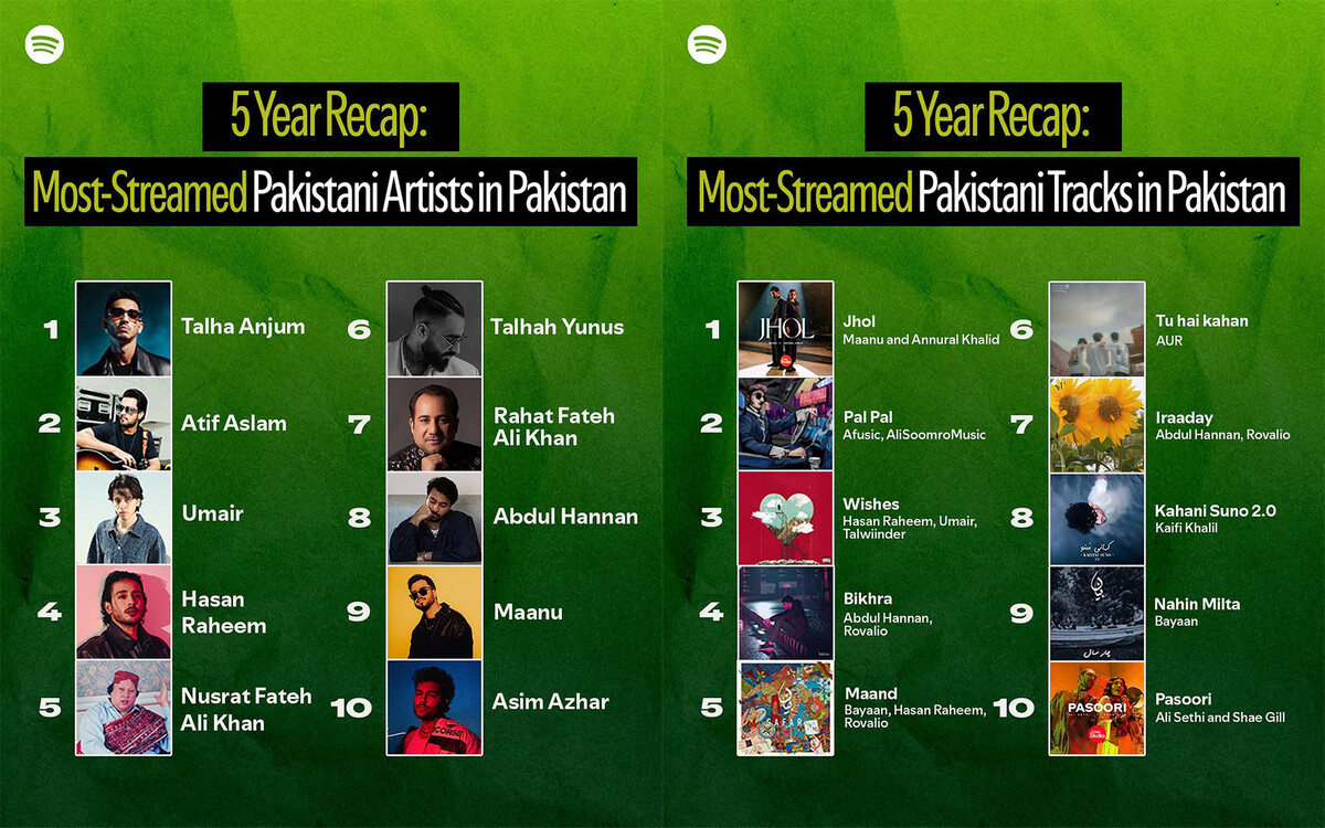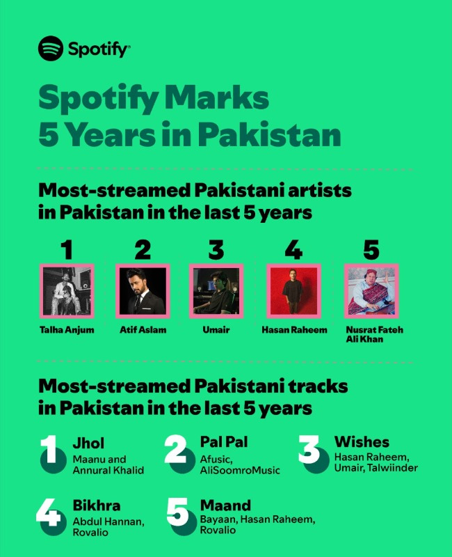سپاٹیفائی پاکستان نے گزشتہ پانچ برس کا ری کیپ جاری کیا ہے جس میں پاکستانی آرٹسٹ اور ان کے گانے مقبول رہے۔ (فوٹو: سپاٹیفائی پاکستان)
