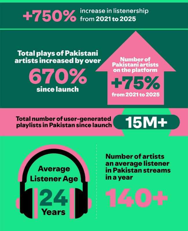 اعداد و شمار سے یہ بھی ظاہر ہوتا ہے کہ 2021 کے بعد پاکستانی فنکاروں کے گیت سننے کی شرح میں سات گنا اضافہ ہوا، جبکہ پلیٹ فارم پر پاکستانی گلوکاروں کی تعداد میں تقریباً 75 فیصد اضافہ دیکھنے میں آیا۔ اس سے مقامی ٹیلنٹ کو نہ صرف ملک میں بلکہ عالمی سطح پر بھی جگہ بنانے کا موقع ملا ہے۔