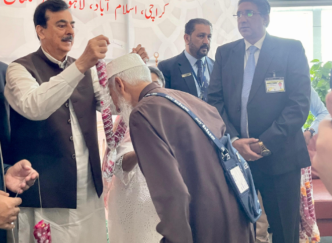 ملتان سے چیئرمین سینیٹ سید یوسف رضا گیلانی و دیگر حکام نے عازمین کو رخصت کیا (فوٹو: وزارت مذہبی امور)