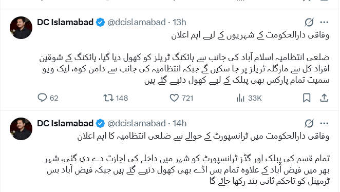 بیان کے مطابق اسلام آباد کی جانب سے ہائیکنگ ٹریلز کو بھی کھول دیا گیا ہے جبکہ دامن کوہ اور لیک ویو سمیت دوسرے پارک بھی عوام کے لیے کھول دیے گئے ہیں۔