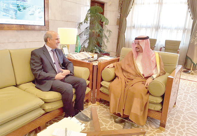 ریاض(جاوید اقبال) سفیر پاکستان خان ہشام بن صدیق نے گورنر ریاض عزت مأب شہزادہ فیصل بن بندر بن عبدالعزیز آل سعود سے ان کے دفتر میں بدھ کو ملاقات کی۔ خان ہشام بن صدیق نے ان کا استقبال کرنے پر گورنر کا شکریہ ادا کیا اور سعودی حکومت اور عوام کی طرف سے نیک ترین خواہشات کا اظہار کیا۔ شہزادہ بندر بن سعود بن عبدالعزیز نے مملکت میں سفیر کے طور پر مامور کئے جانے پر خان ہشام بن صدیق کو مبارکباد دی اور ان کی کامیابیوںکے لئے نیک خواہشات ظاہر کیں۔ دونوں نے پاکستان اور مملکت کے باہمی تعلقات پر تبادلہ خیال کیا جبکہ گورنر نے مملکت میں فرائض کی ادائیگی کے لئے خان ہشام بن صدیق کو اپنے مکتب الامارہ کی مکمل حمایت کا یقین دلایا۔ سفیر پاکستان نے گورنر ریاض سے منطقہ ریاض میں مقیم پاکستانی تارکین، اسکولوں کی عمارات اور افرادی قوت سے مربوط امور پر بات چیت کی۔ شہزادہ فیصل بن بندر آل سعود نے مملکت کی تعمیر وترقی میں پاکستانیوں کے کردار کو سراہا اور انہیں انتہائی قابل اعتماد ساتھی قرار دیا۔ خان ہشام بن صدیق نے اس امید کا اظہار بھی کیا کہ دونوں ممالک کے باہمی برادرانہ تعلقات مزید مضبوط اور گہرے ہوں گے۔