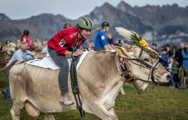 سوئس پہاڑوں کے دل میں واقع تفریحی مقام پر خواتین کی گائے دوڑ